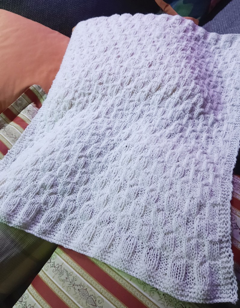 Die Anleitung ist von Drops Design. Gestrickt habe ich mit einem Merinogarn in weiß, das ich noch von einem anderen Projekt übrig hatte. Und die Menge hat gerade so gereicht für die Decke – perfekt.
