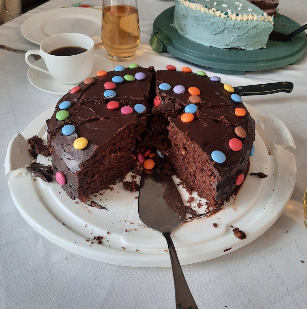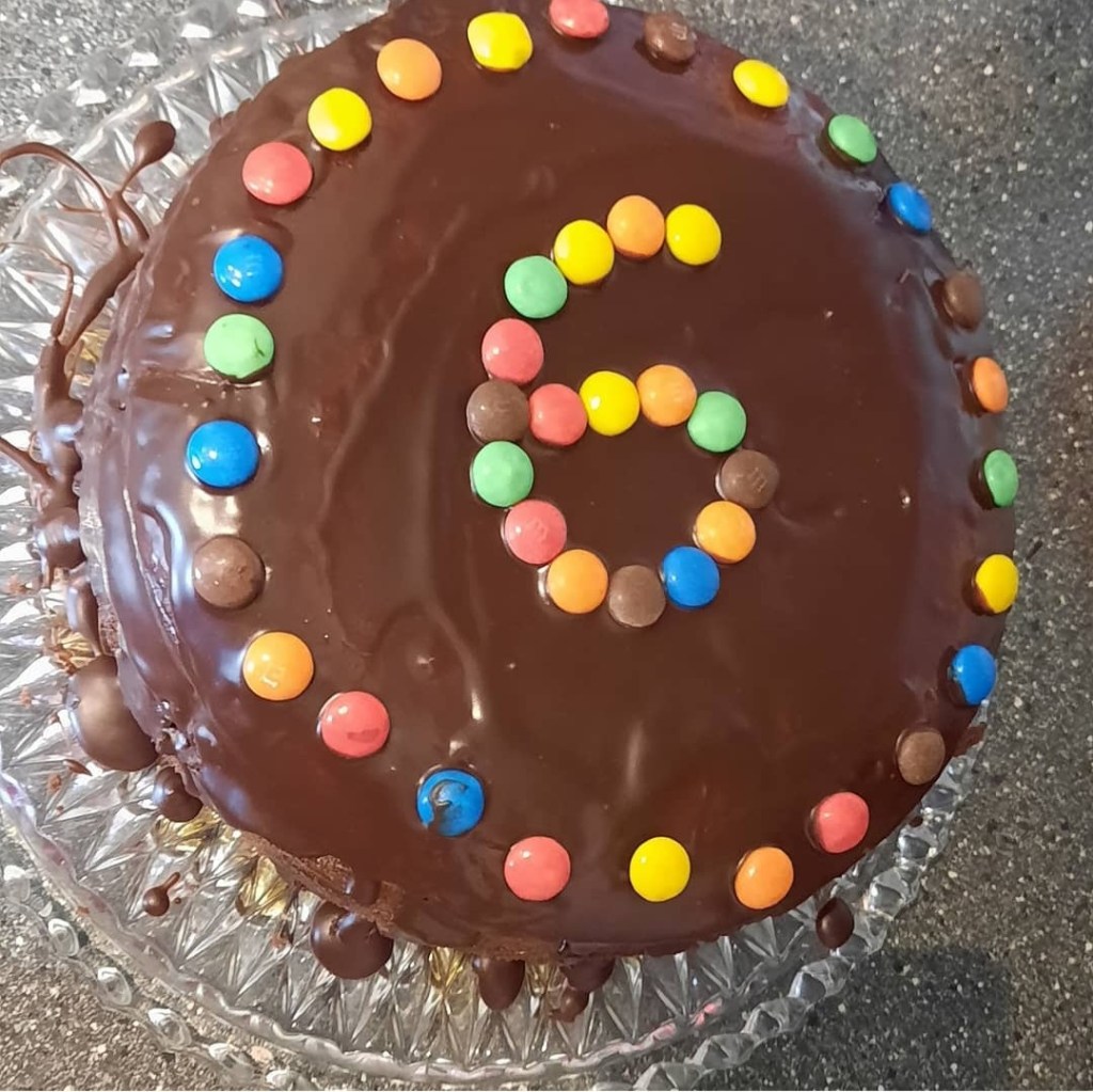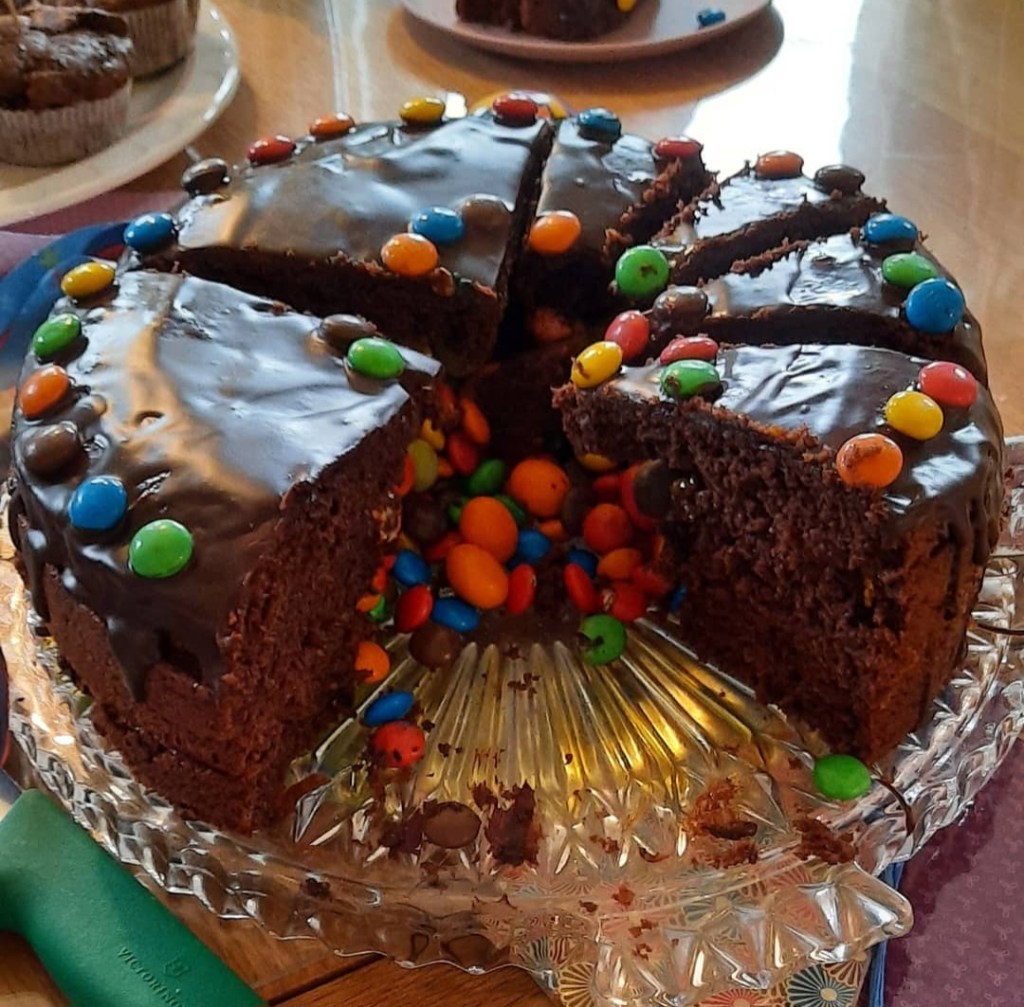 Der Kuchen besteht aus 4 Böden, aus den unteren 3 wird in der Mitte mit einem Glas ein Loch austanzt. Die Böden werden mit Marmelade bestrichen und zusammengesetzt. Bevor der Deckel (4. Boden) aufgesetzt wird, befüllt man das Loch mit Schokolinsen oder anderen Süßigkeiten. Deckel drauf und dann kommt noch eine Schokoglasur auf den Kuchen und na klar, noch ein bisschen Zucker-Deko.