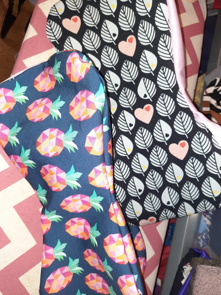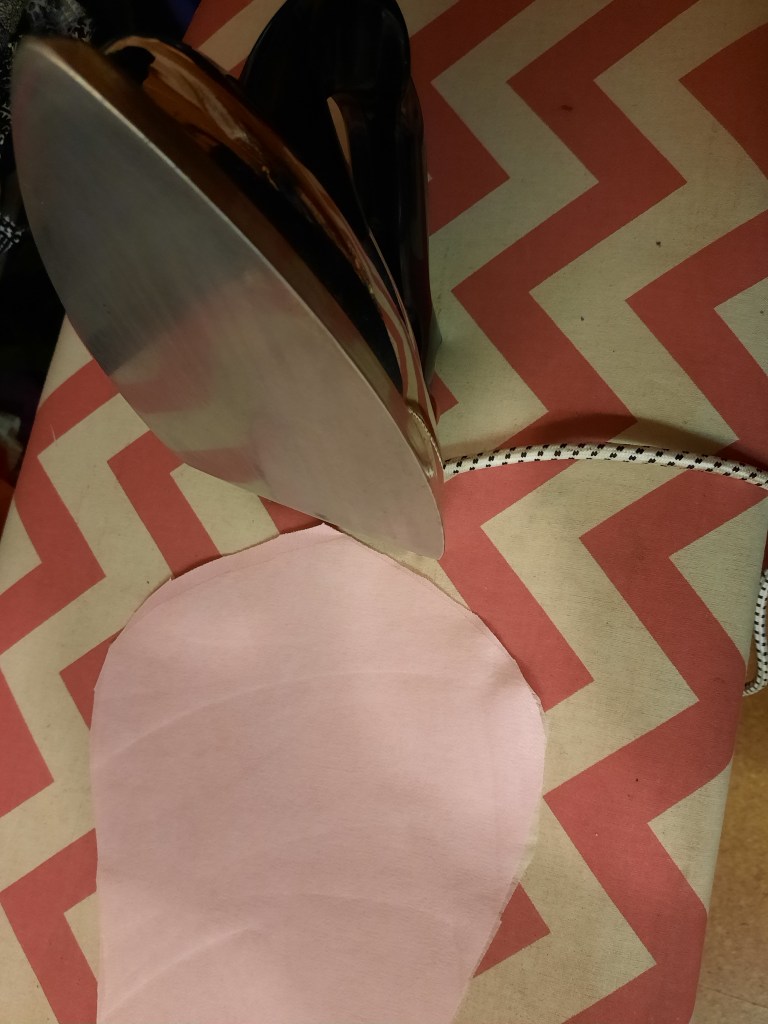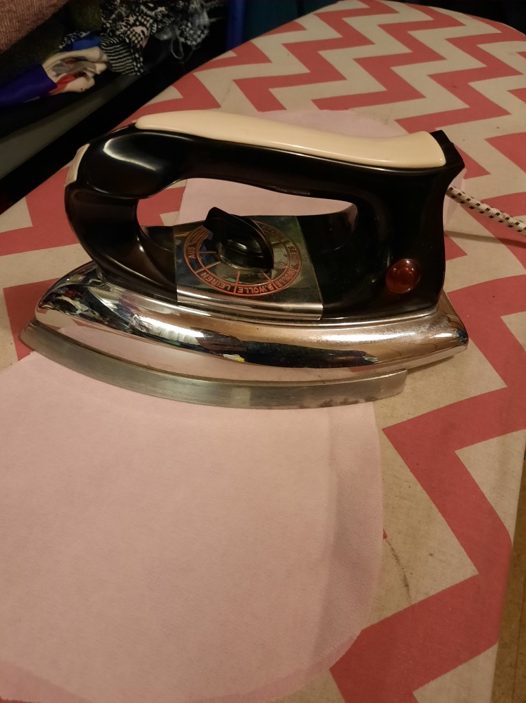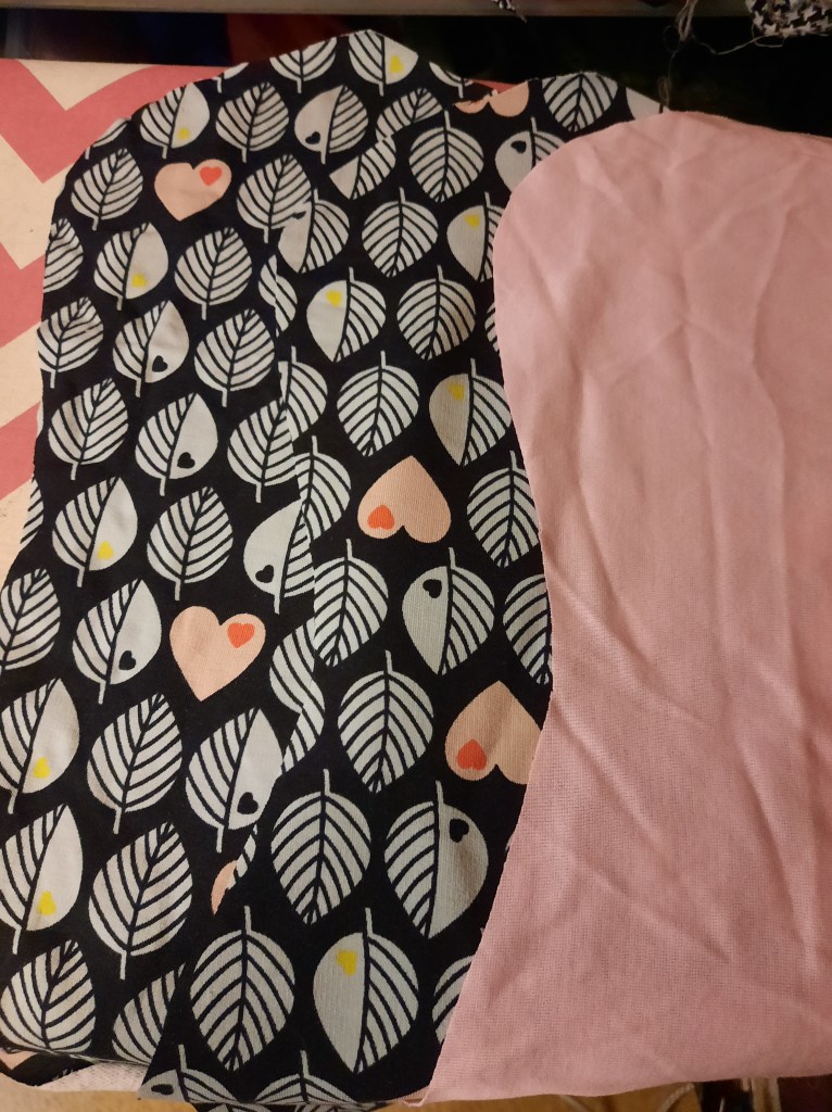 In meinem großen Stoffvorrat habe ich eine Kiste mit verschiedenen mittelgroßen Jersey-Stoffresten. Ich hab je zwei Seiten aus dem gleichen Musterstoff und die dritte Seite je aus einem einfarbig rosa Jersey zugeschnitten. Dann habe ich auf alle Schnitteile Vlieseline aufgebügelt. Dafür nutze ich immer ein wirklich sehr altes Bügeleisen, das eine ganz glatte Bügelfläche ohne Dampföffnungen hat. Das funktioniert für mich bei Aufbügeln von großflächiger Einlage am Besten.