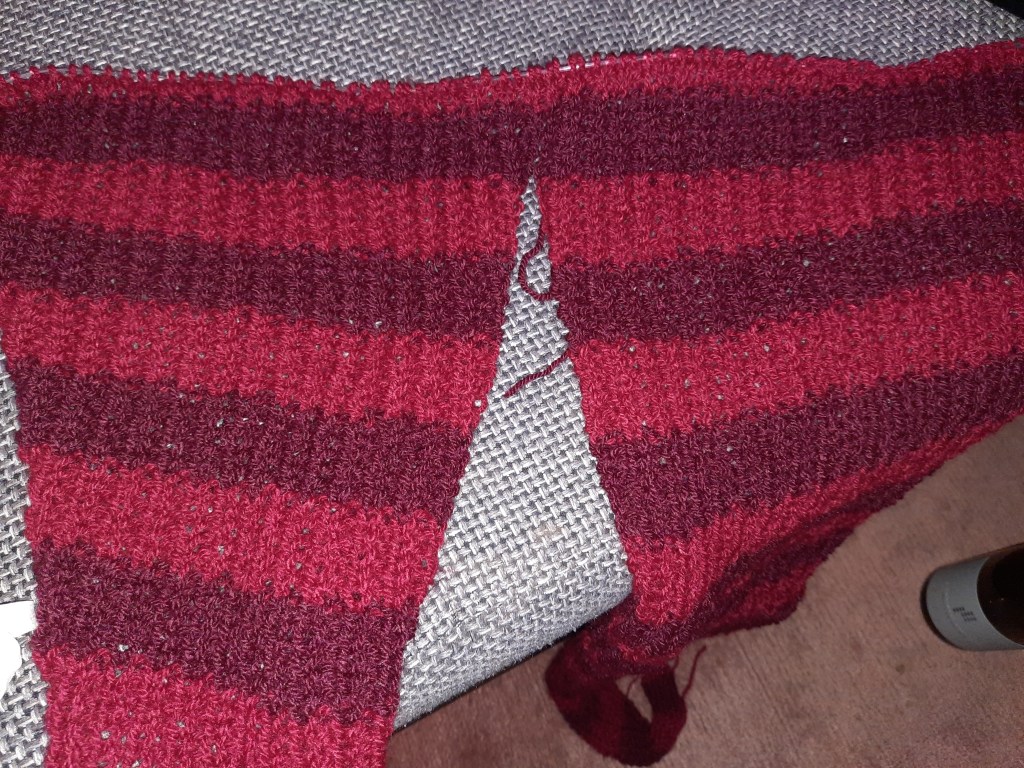 Zuerst werden die zwei Schalteile gestrickt Gestrickt wird im Halbpatent mit tiefgestochenen Maschen. In jeder 10. Reihe werden 2 Maschen aufgenommen, danach habe ich dann auch immer die Farbe gewechselt.