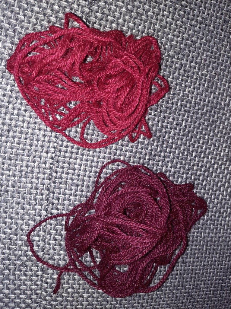 Von meiner Mama habe ich zwei Truhen mit Wollresten geerbt. Und für einen weiteren Kapuzenschal wollte ich auch wieder auf bereits vorhandene Wolle zurückgreifen und den Resteabbau weiter fortsetzen. Gefunden habe ich von der Junghans Wolle „Poco“ 4 Knäuel, je 2 in der gleichen Farbe. Einmal weinrot einmal aubergine. Die Farben passen gut zusammen, also war der Plan geboren einen gestreiften Schal damit zu stricken.