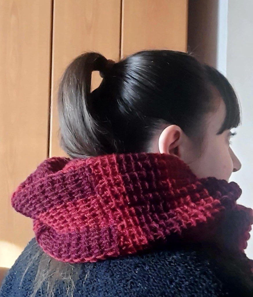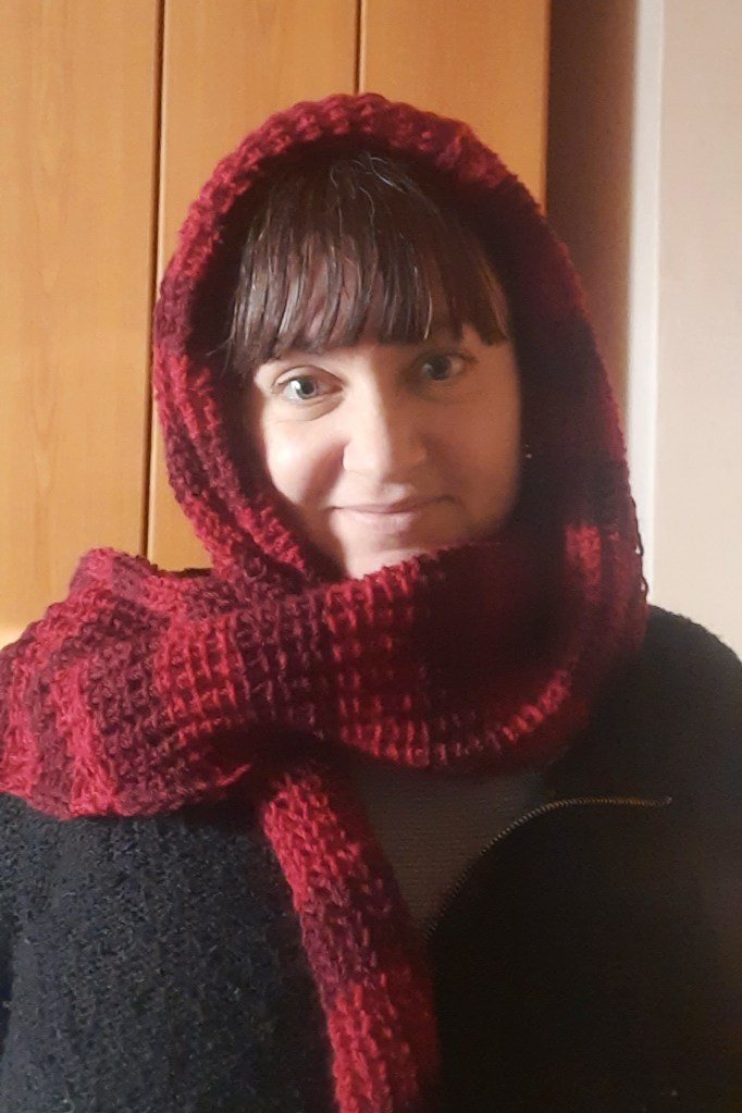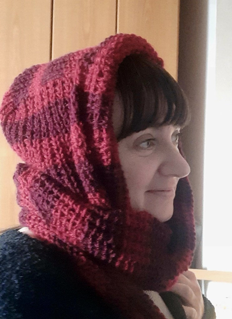 Der Kapuzenschal, den ich im Dezember letztes Jahr gestrickt habe war ein Test, ob mir so ein Schal überhaupt steht und praktisch ist. Der Schal sieht gut aus, ist tragbar, aber nicht allzu warm. Da uns der Winter noch sehr im Griff hat wollte ich noch einen wärmeren Kapuzenschal stricken.