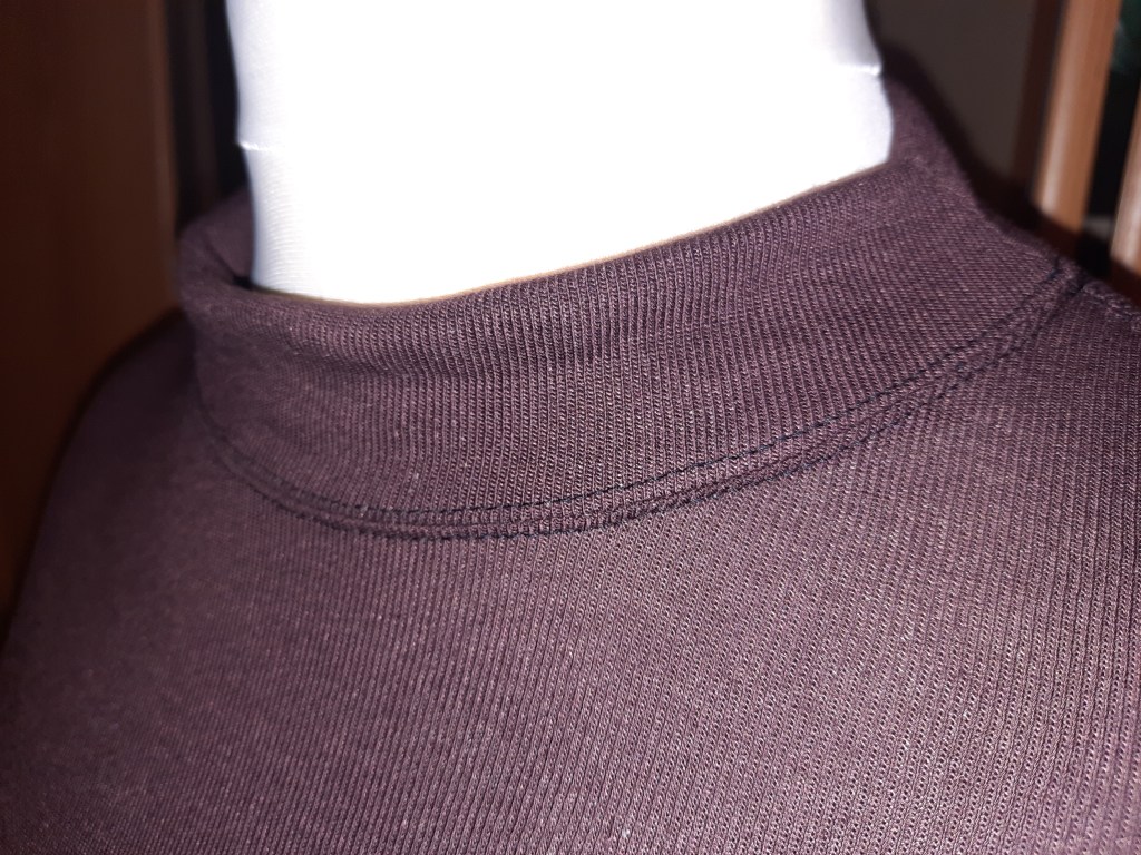 Das Shirt war schnell zugeschnitten und genäht. Ich habe die Schulternaht und die Naht wo der Ärmel eingesetzt ist mit einem Wabenstich abgesteppt (Version B in der Ottobre). Mit dem gleichen Wabenstich habe ich die Ärmelsäume genäht. Den Saum des Shirts habe ich mit einer Zwillingsnadel genäht. Das Kragenteil habe ich nicht als Rollkragen genäht, weil ich Viskosestrick nicht sehr stabil ist und vermutlich nicht schön am Hals angelegen hätte oder zu eng geworden wäre. Stattdessen habe ich die Ausschnittlösung des Ottobre Shirts Vintage Lines (Ottobre Woman 5/2016) genutzt.