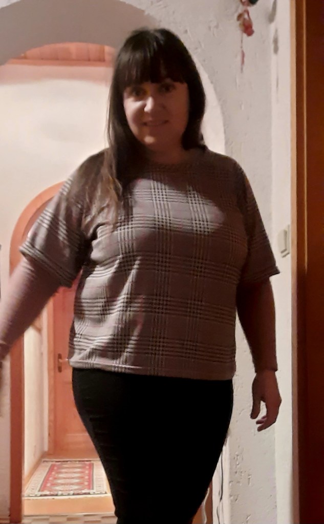 Zuerst dachte ich, dass ich irgendwo noch ausreichend Reste von Sweatstoff hätte, war dann aber nicht so. Dann habe ich in meinem Stoffregal einen tollen Jersey-Strickstoff entdeckt, der schon sehr lange in meinem Stash lag, perfekt für das Shirt. Ich glaube, dass der Strickstoff mit Hahnentrittmuster und Karo in pink, von Driessenstoffen ist, bin aber nicht ganz sicher.