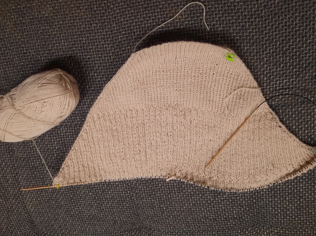Los ging es mit dem Rückenteil, wo kontinuierlich Zunahmen gestrickt werden. Sieht schon ganz gut aus.